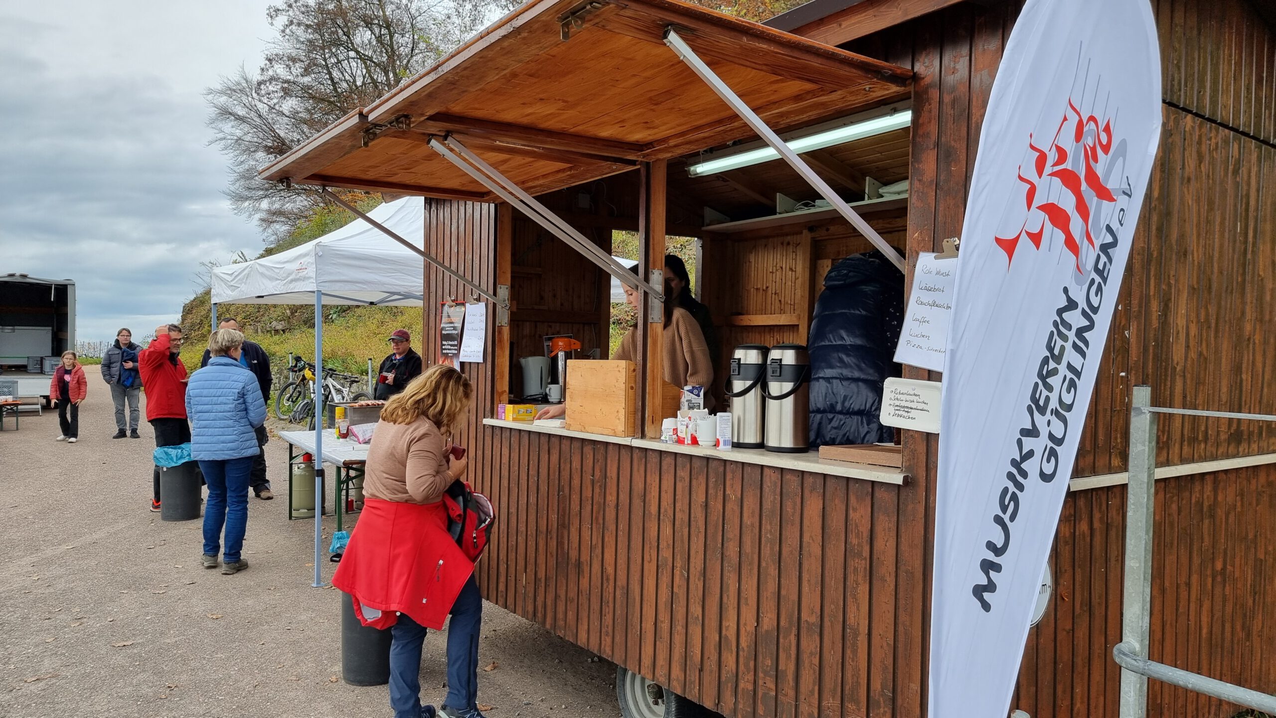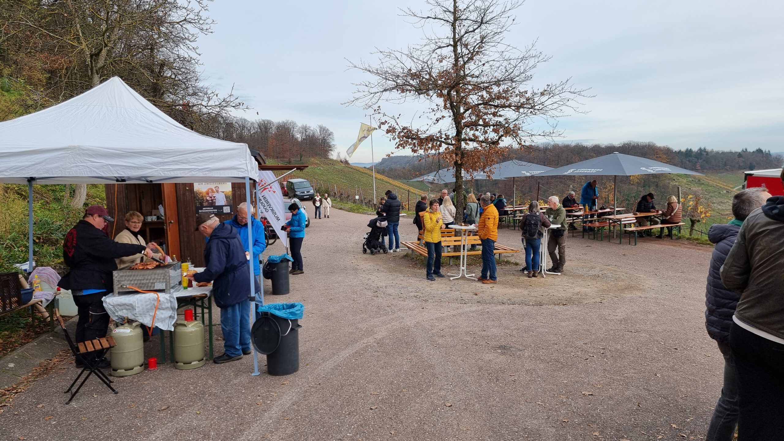 Am Sonntag, 16. November, setzte der Musikverein Güglingen das Wochenende mit der Bewirtung auf dem Zweifelberg bei Brackenheim fort. Bei milden Temperaturen und weiter Fernsicht genossen zahlreiche Gäste regionale Weine, Glühwein, herzhafte Rote Würste, Käse- und Rauchfleischbrote sowie selbst gebackenen Kuchen. Glühwein und Wein fanden gleichermaßen großen Zuspruch und passten ideal zur entspannten Atmosphäre. Viele Besucher verweilten bis in die späten Nachmittagsstunden, nutzten die Gelegenheit zu Begegnungen und ließen das vielfältige Musik- und Genusswochenende in geselliger Runde ausklingen.