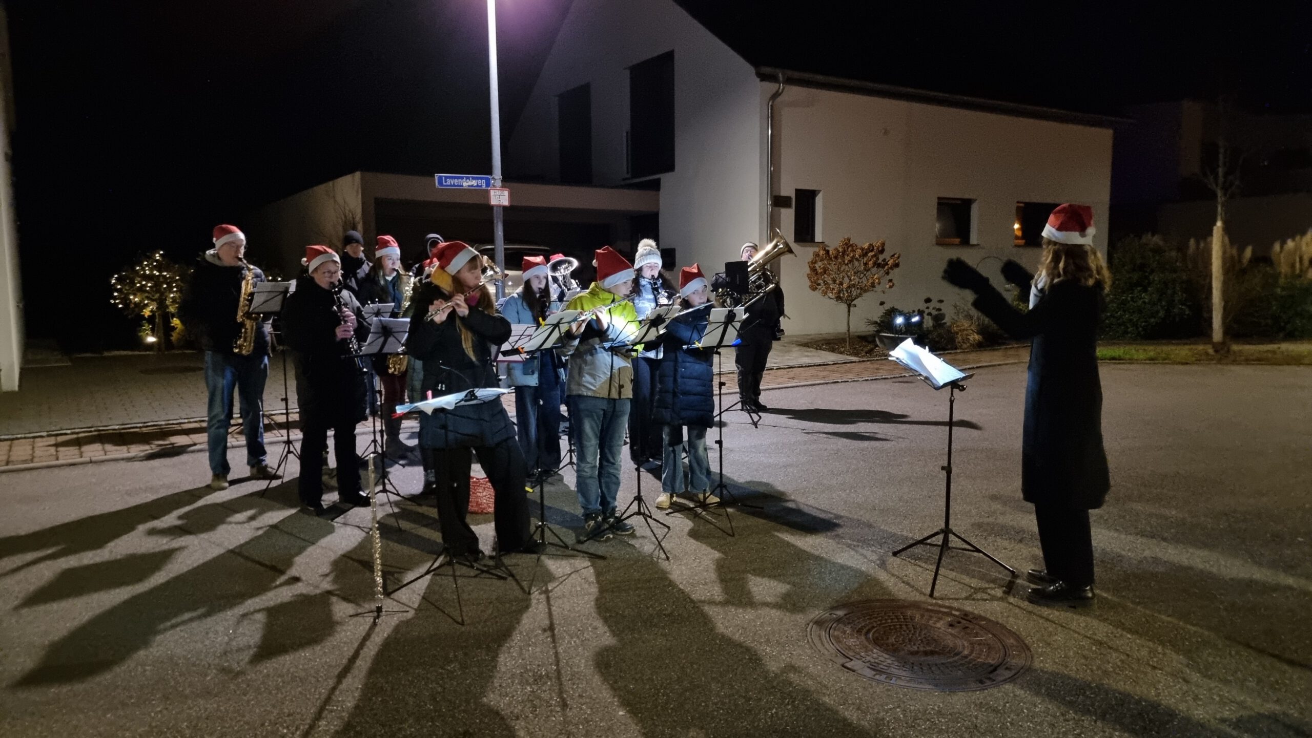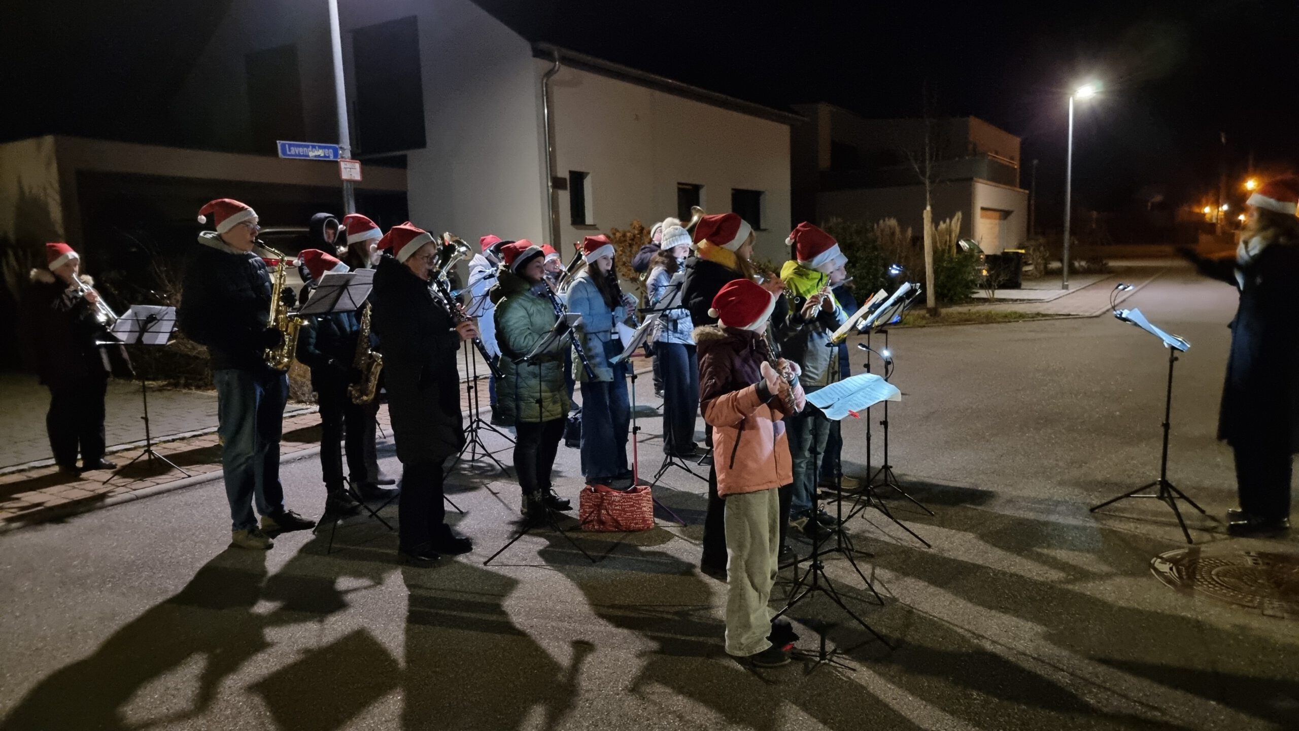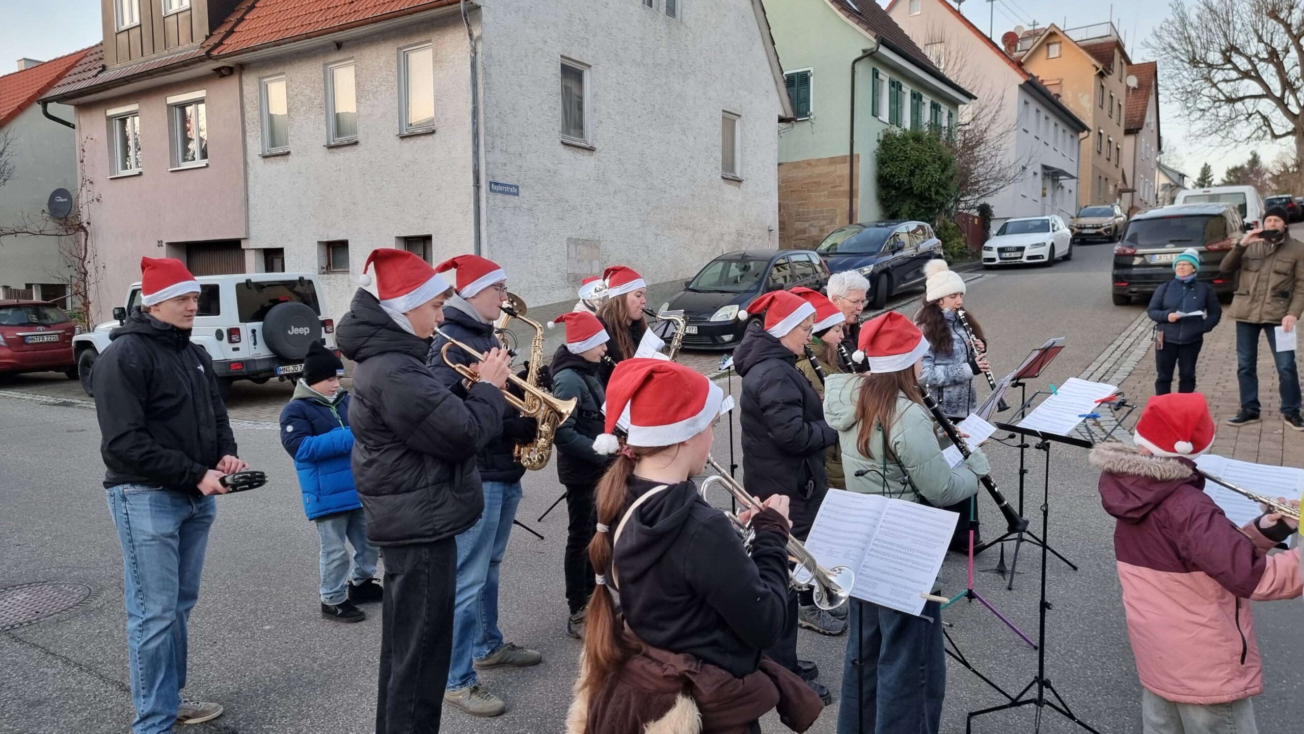 Am 4. Advent waren die Musikerinnen und Musiker des Musikverein Güglingen in der Stadt unterwegs, um mit bekannten Weihnachtsliedern zum Mitsingen auf die Festtage einzustimmen. Erste Station war die Wilhelmstraße, wo sich zahlreiche Bürger bei Punsch und Glühwein versammelten und die adventliche Atmosphäre genossen.